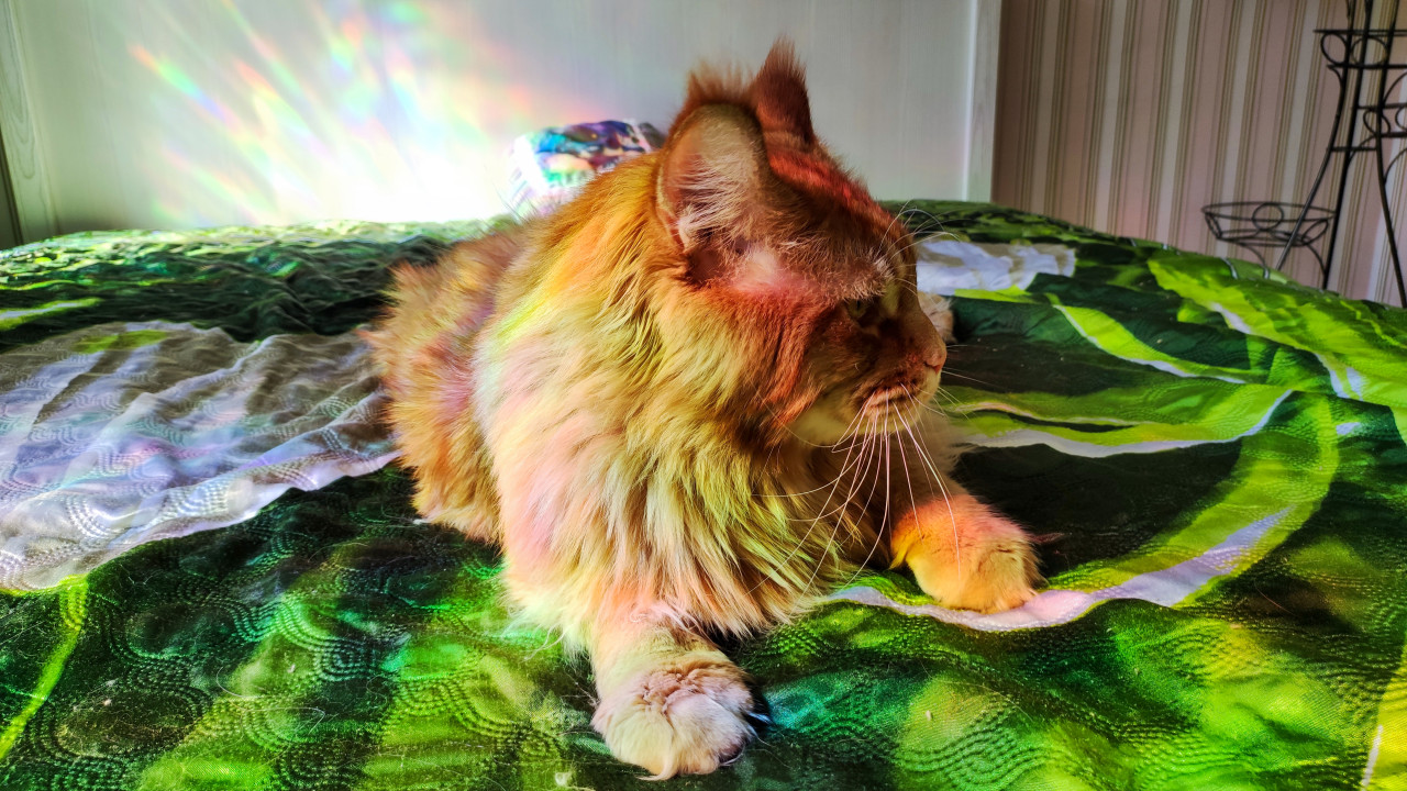 животное кошка кот домашний питомец порода кошек лежит отдых лапы хвост уши взгляд портрет животного мейн кун крупная порода рыжий кот длинношёрстный сидит лапы поджаты профиль усы кисточки на ушах шерсть радужные лучи радужные блики отражение света солнечный свет дневной свет дом интерьер спальня кровать зелёное покрывало подушка обои уют световые эффектыПохожие фотографии