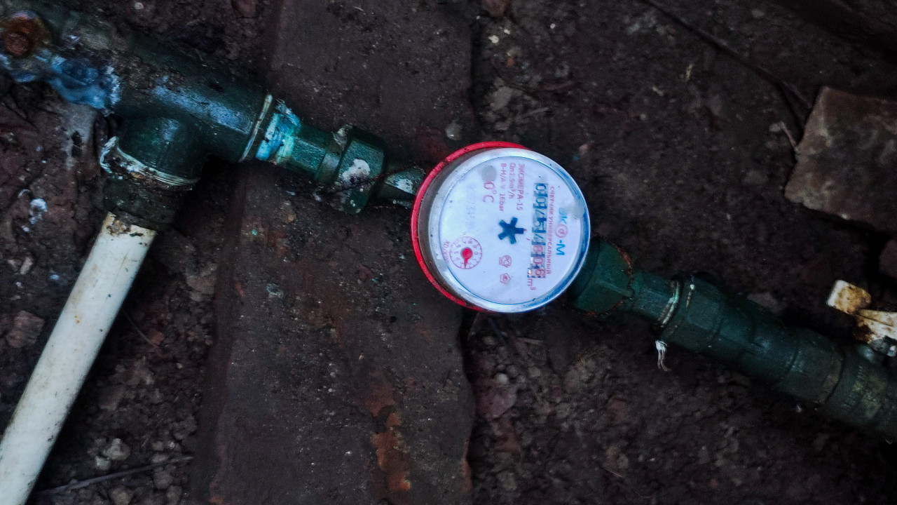 Крупный план водосчётчика, установленного на участке трубопровода в земляном приямке. В кадре видны круглый циферблат прибора, металлические фитинги и резьбовые соединения, переход на пластиковую трубу, запорная арматура, а также грунт и фрагменты основания вокруг узла. Следы влаги и загрязнений подчёркивают эксплуатационные условия инженерных сетей. Фото подходит для материалов о ЖКХ, сантехнике, обслуживании коммуникаций, поверке приборов учёта и ресурсосбережении.