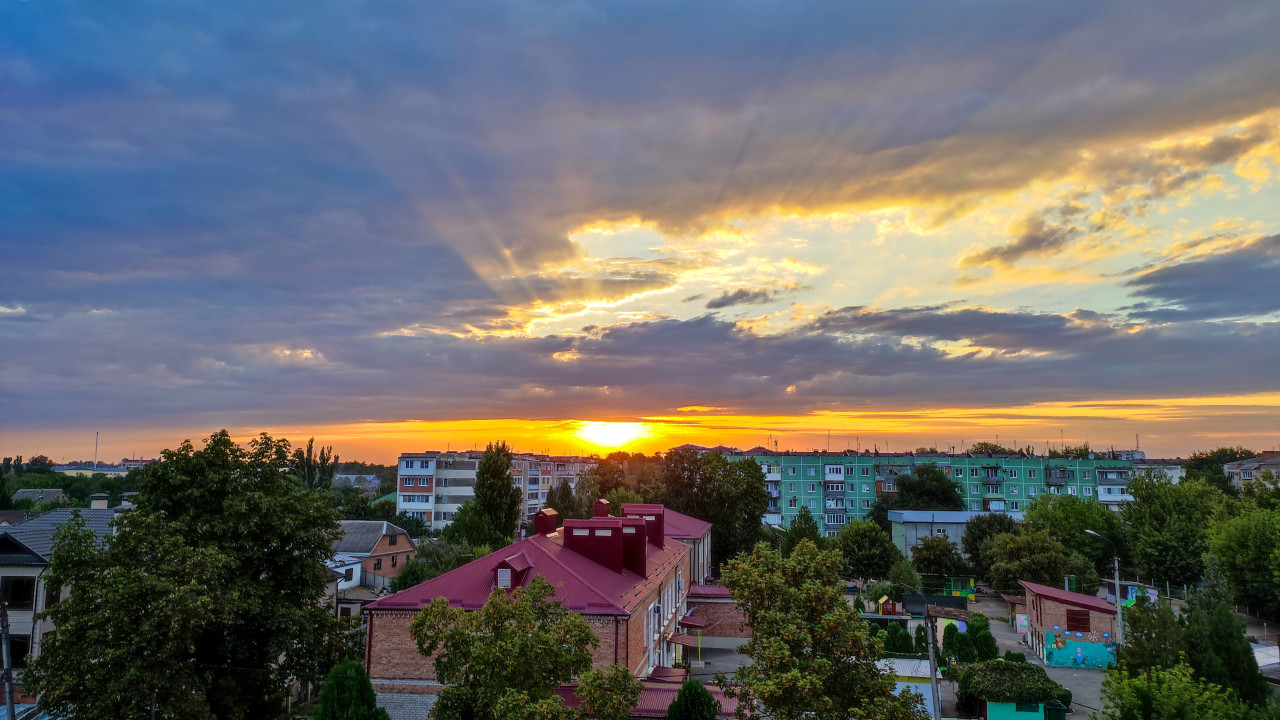 пейзаж город городской пейзаж закат вечер сумерки небо облака лучи солнца горизонт жилой район панельные дома пятиэтажки деревья вид с высоты солнце яркое солнце вечерний свет облачный фронт контраст многоквартирные дома частный сектор зелень двор городская окраина вид из окна красная крыша спокойный вечер атмосферная погода природное явление панорамаПохожие фотографии