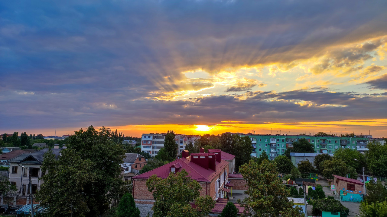 пейзаж город городской пейзаж закат вечер сумерки небо облака лучи солнца горизонт жилой район панельные дома пятиэтажки деревья вид с высоты городской вид вечернее небо облачность драматические облака солнце у горизонта солнечные лучи светотень панорама жилые дома многоэтажки панельный дом пятиэтажка квартал спальный район парк зеленая зона крыши домов кирпичное здание красная крыша двор вид из окна спокойствие лето атмосферный свет природа и городПохожие фотографии