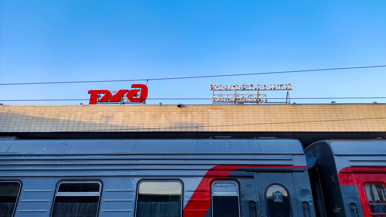 Вывеска «Ростов-Главный» и логотип РЖД над пассажирским вагоном на перроне