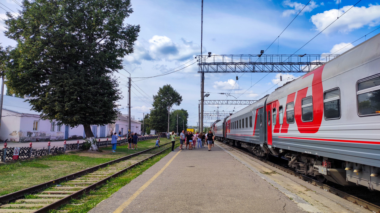 транспорт железная дорога станция вокзал инфраструктура путешествие поезд пассажирский поезд РЖД вагоны платформа перрон пути шпалы рельсы контактная сеть провода пассажиры ожидание посадка регион пригород станционные здания ограда дерево зелёная зона облака туризм железнодорожный пейзажПохожие фотографии