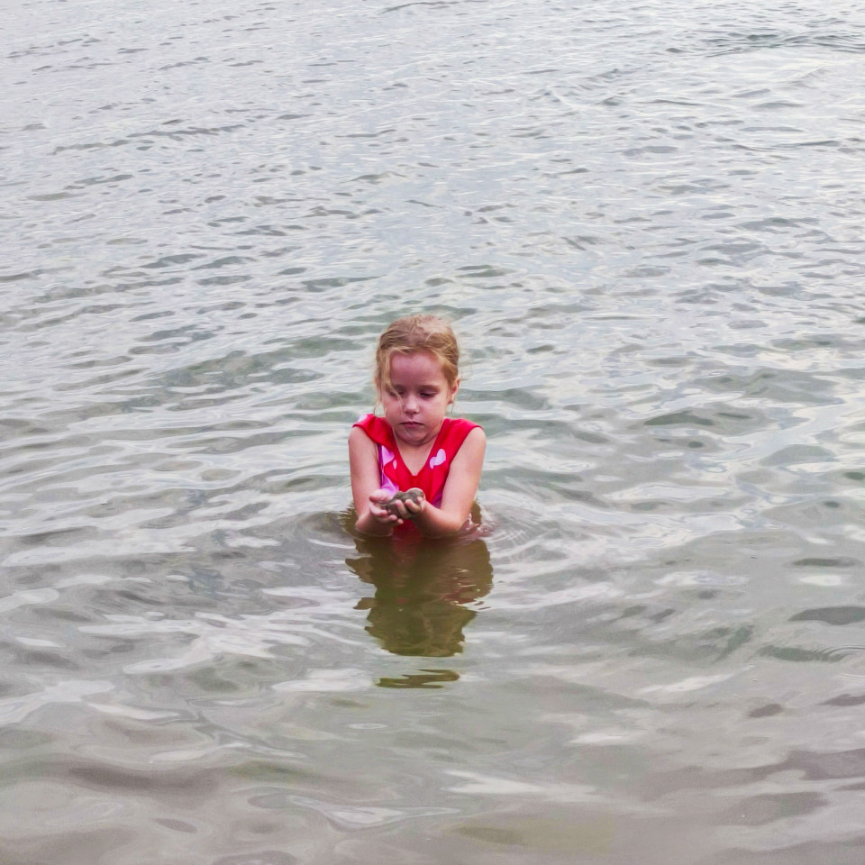 Девочка в красном купальнике стоит по грудь в воде и держит камни в ладонях