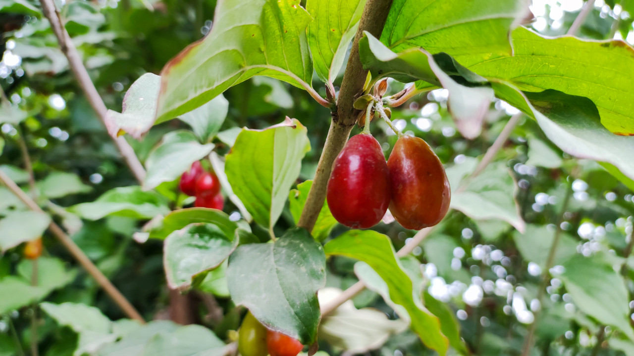 Крупный план ягод кизила на ветке среди зелёных листьев