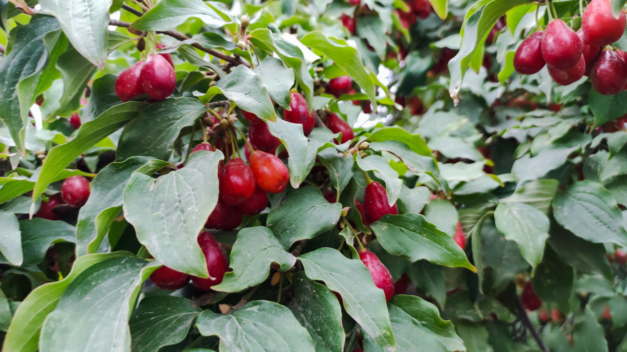 природа растение кизил кизил обыкновенный ягоды плоды красные ягоды ветка листья зелёная листва урожай созревание сад красные плоды гроздья куст дерево садоводство плодовое растение сбор урожая сезонные ягоды натуральные продукты фермерство ботаника флора кулинария компот варенье заготовки витаминный продуктПохожие фотографии
