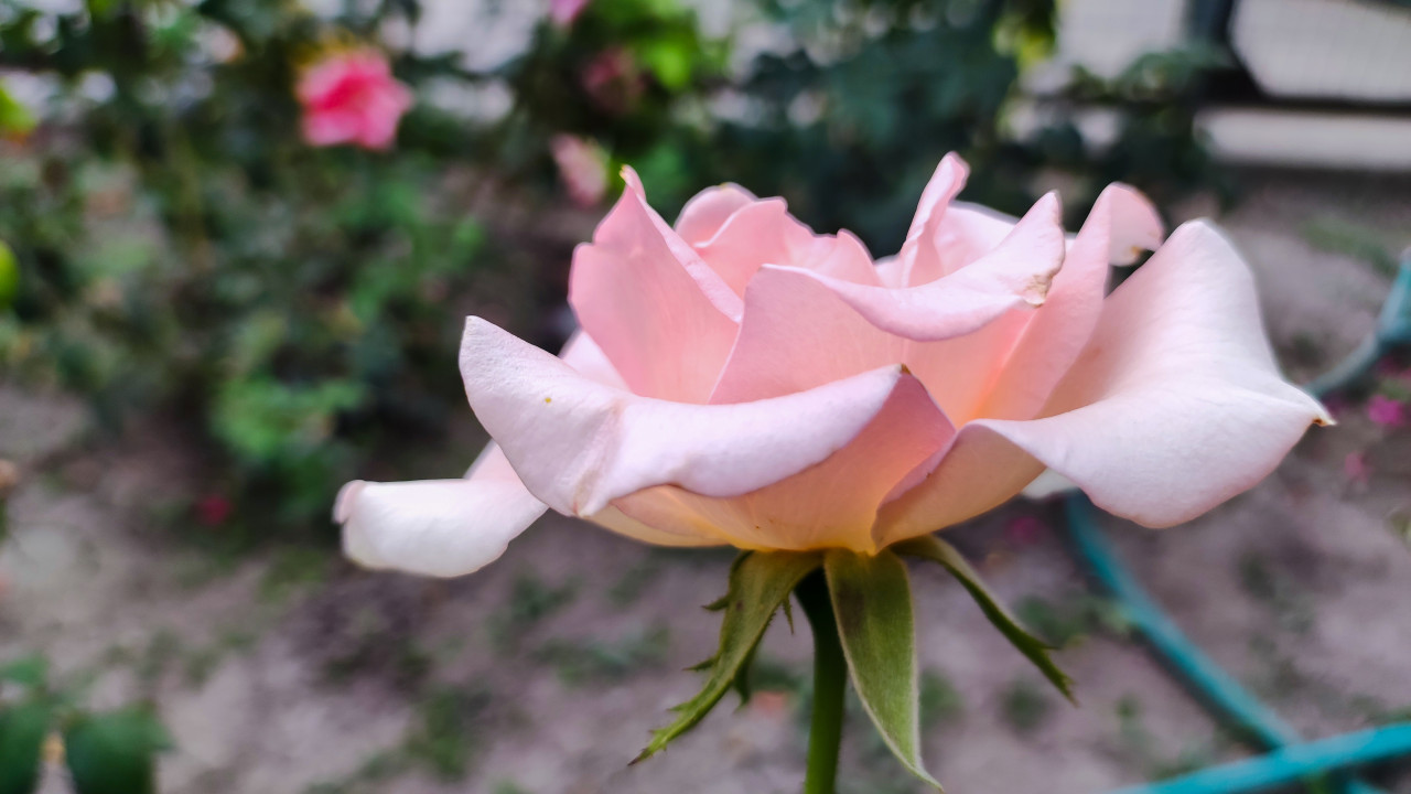 Нежно-розовая роза в боковом ракурсе, снятая крупным планом так, что лепестки заполняют почти весь кадр. Различимы плавные изгибы и тонкая текстура поверхности, а у основания заметны зелёные чашелистики и часть стебля. Фон размыт: читаются пятна грунта и зелени цветника, что усиливает ощущение садовой среды и естественного света. Фотография подходит для тем флористики, романтического дизайна, поздравительных макетов, а также для статей о сортах роз и сезонном цветении в саду. Её можно использовать как декоративный фон для баннеров, упаковки и полиграфии.