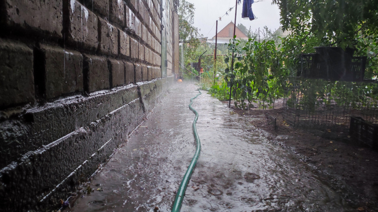 погода дождь ливень пасмурный день капли воды вода непогода мокрый двор брызги лужи поток воды подтопление бетонная дорожка кирпичная стена фасад дома садовый шланг частный дом участок дача огород грядки растения сырость дренаж водоотведение коммунальные проблемы летний дождь бытовые условия инфраструктураПохожие фотографии