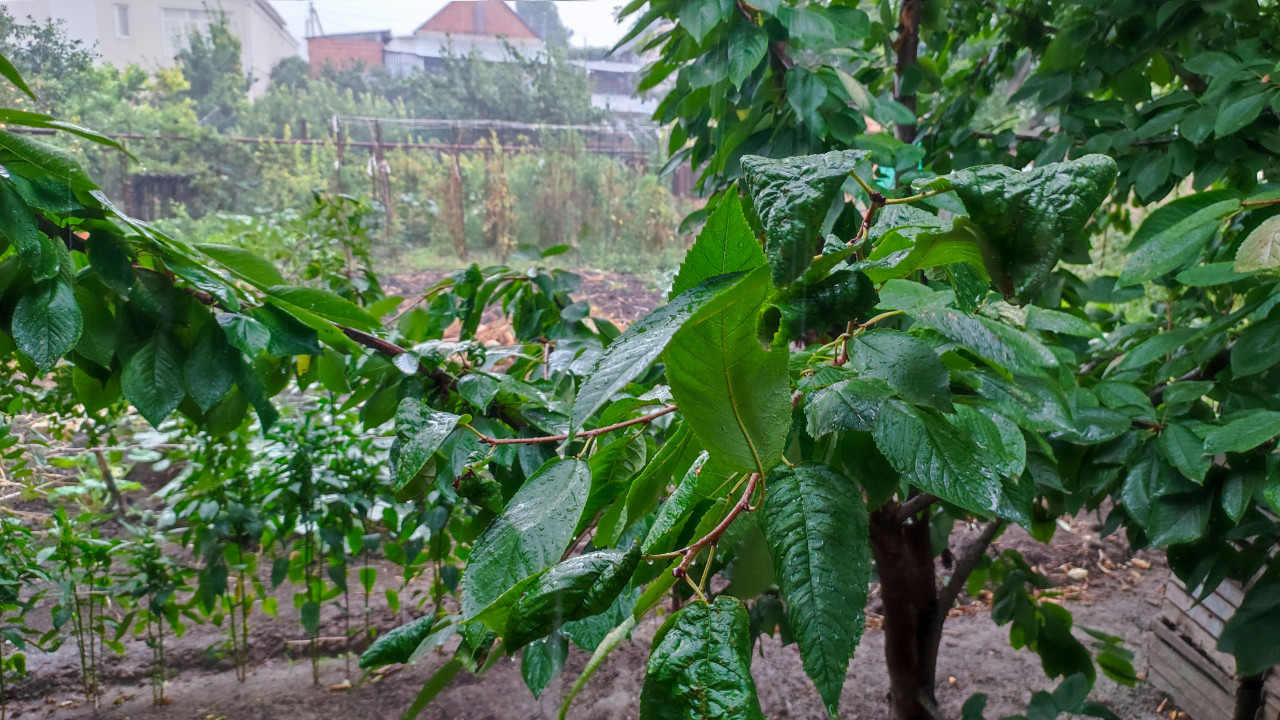 погода дождь ливень пасмурный день капли воды вода природа мокрые листья листва зелень крона дерева ветви дерево сад дача частный участок огород грядки влажная почва летняя погода садоводство растение черешня листья черешни плодовое дерево садовые деревья уход за садом сезон дождливая атмосфераПохожие фотографии