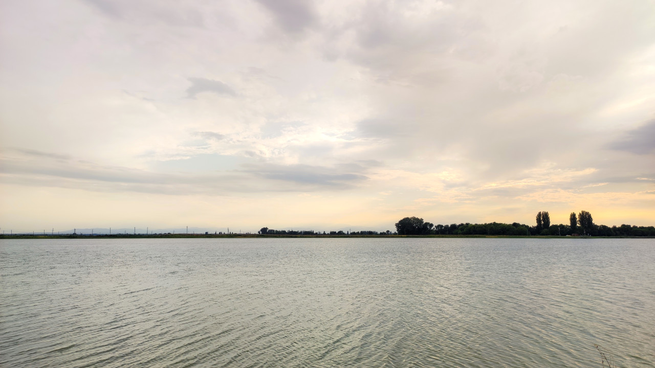 Панорамный вид на водоём с широкой полосой воды и спокойным небом. Поверхность покрыта мелкой рябью, свет распределён ровно, без резких контрастов; в правой части горизонта выделяется группа деревьев и тёмная кромка берега. Облачность многослойная, с тёплыми оттенками у линии горизонта, что создаёт ощущение вечерней прохлады у воды. Фотография подходит для тем о природе, путешествиях, сезонных пейзажах, а также для фоновых изображений и заставок.