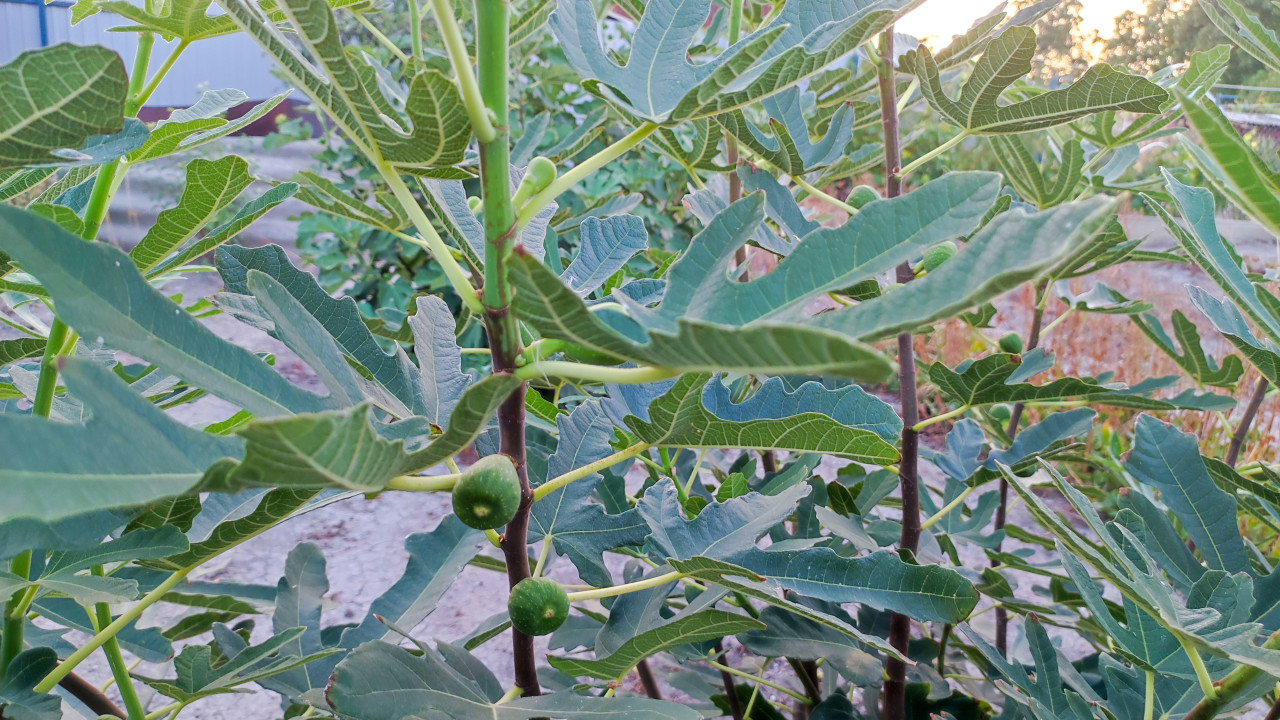 Кадр заполнен резными листьями инжира, между которыми заметны небольшие зелёные плоды, только набирающие размер на стволиках и черешках. Растение снято на уровне кроны, поэтому видна структура листовой пластинки и характерные жилки, а фон с дорожкой, почвой и растениями размыт и не отвлекает от главного объекта. Такая съёмка показывает стадию формирования урожая и подходит для иллюстрации теплолюбивых культур в частном саду (Северная Осетия, окрестности Владикавказа). Фотография может использоваться в материалах о выращивании инжира, садоводстве, экопродуктах, агротехнике и сезонных наблюдениях за растениями.