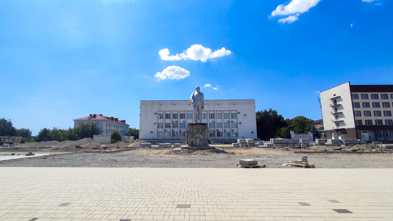 На снимке большая открытая площадь с широким участком свежего плиточного покрытия на переднем плане. В центре композиции — памятник В. И. Ленину на постаменте, за ним расположено административное здание с характерной советской архитектурой, а справа виден современный корпус общественного назначения. Вокруг памятника продолжаются работы по благоустройству: заметны насыпи грунта, щебёночная подушка и поддоны с плиткой. Монументальная скульптура советского периода выступает историческим маркером городской среды. Фото можно использовать для тем о реконструкции площадей и развитии городской инфраструктуры.