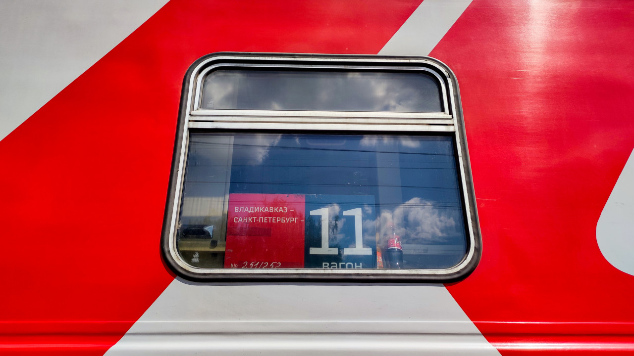 Окно пассажирского вагона с табличкой маршрута «Владикавказ — Санкт-Петербург»