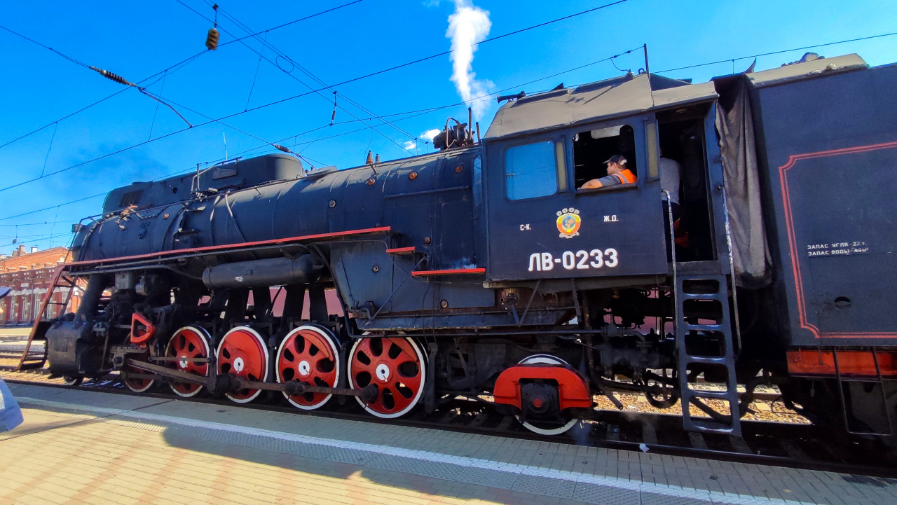 Паровоз ЛВ-0233 показан целиком сбоку на железнодорожной станции: чёрный котёл, красные колёсные пары и тяги ходовой части хорошо читаются на фоне плитки пассажирской платформы. Из трубы выходит струя пара, в кабине заметен сотрудник в сигнальном жилете, а к переходу на тендер ведёт лестница. Над путями натянута контактная сеть, рядом проходят рельсы с щебёночным балластом, на заднем плане видны кирпичные строения станции. Серия ЛВ относится к послевоенному периоду середины XX века и считается одной из поздних магистральных пассажирских паровозных серий. Фото подойдёт для статей о транспорте, истории техники и железнодорожных путешествиях.