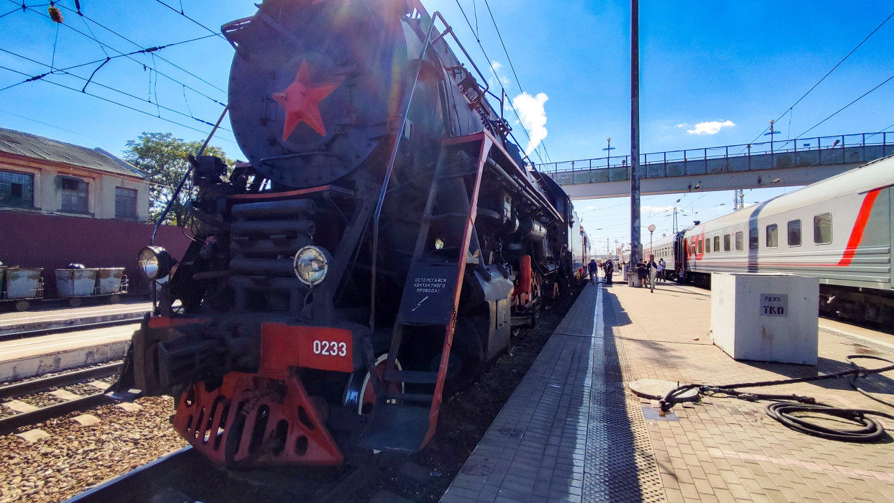 транспорт железная дорога паровоз локомотив ретро поезд историческая техника станция платформа перрон лв 0233 железнодорожная станция вокзал пути рельсы контактная сеть ЛВ 0233 красная звезда пар дым солнечные блики перспектива пешеходный мост пассажиры пассажирский поезд вагоны станционные здания инфраструктура путешествия туризм репортаж исторический транспортПохожие фотографии