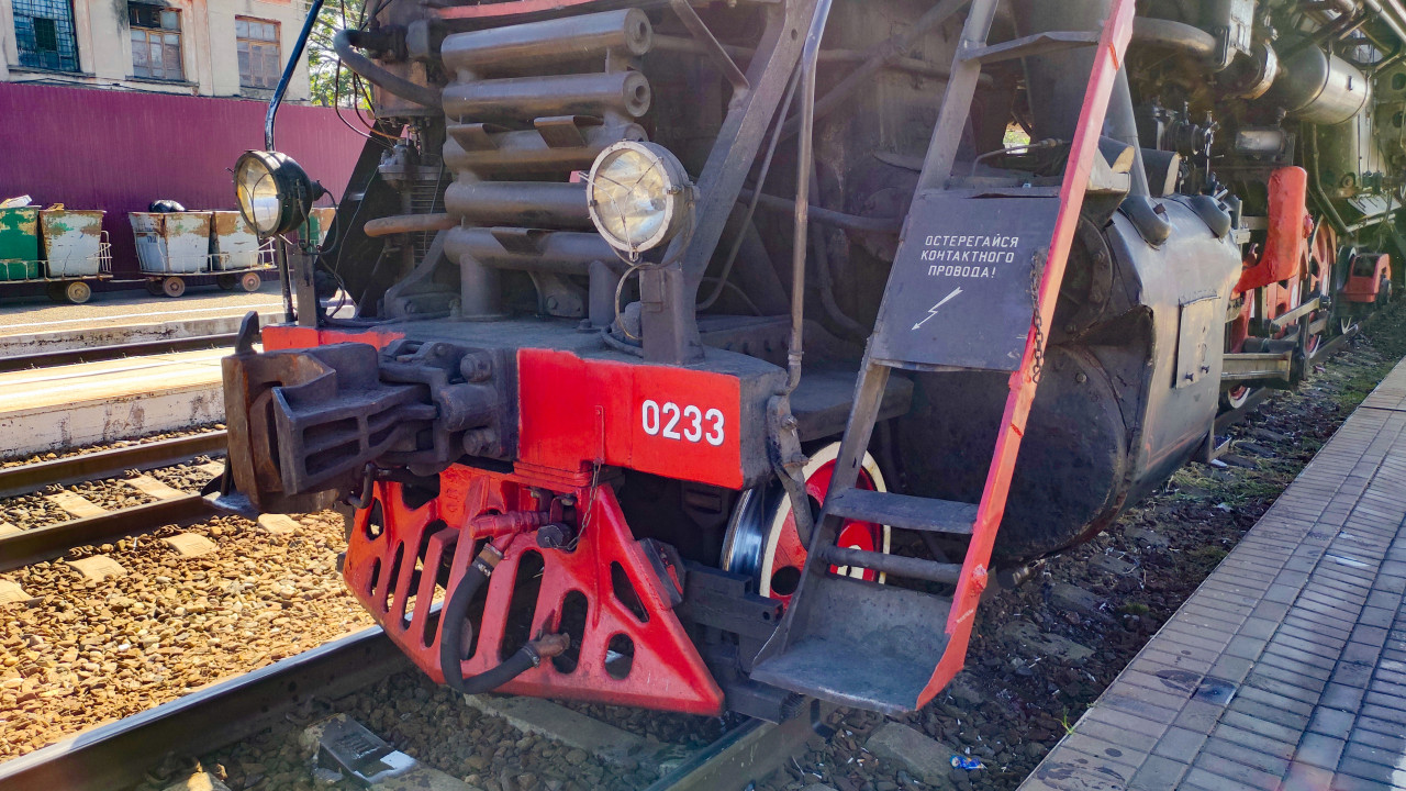 Детальный фрагмент передней части паровоза: крупно показаны автосцепка, отбойник и нижняя решётка, сигнальные фонари, номер «0233» на красной планке и ступени с предупреждающей табличкой «Остерегайся контактного провода!». На фоне видны рельсы и щебёночный балласт, край пассажирской платформы с плиткой и урны на тележках у служебной зоны станции. Снимок передаёт фактуру металла, следы эксплуатации и конструктивные детали ходовой части. Фотография подходит для технических статей о железнодорожной технике, учебных материалов, каталогов музеев и иллюстраций о безопасности на транспорте.