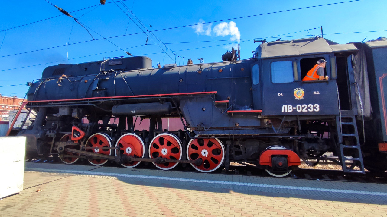 транспорт железная дорога паровоз локомотив ретро поезд историческая техника станция платформа перрон лв 0233 поезд ретро техника история промышленность инженерия механика колёса шатун пар дым сталь металл чёрный цвет красные колёса машинист железнодорожник рабочая форма контактная сеть железнодорожная инфраструктура музейный поезд туризмПохожие фотографии