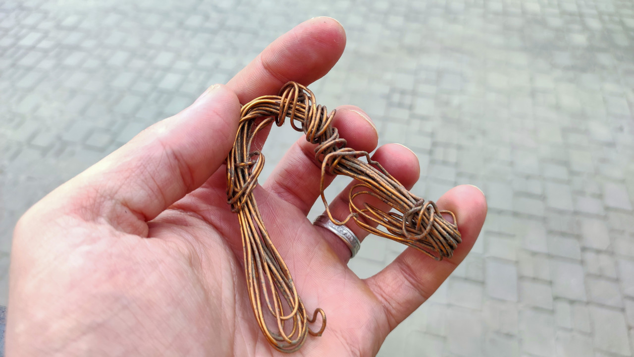 Рука человека держит скрученный пучок тонкой медной проволоки с узлами и петлями, похожими на самодельный крючок или крепёж. На металле видны потемнение и следы окисления, витки разной толщины и неровные концы. Фон нейтральный и размытый: мощение тротуарной плиткой на улице, что подчёркивает предмет в ладони. Кадр сделан при дневном свете без вспышки. Фотография подходит для иллюстраций тем DIY, ремонта, временных креплений, проводов и кабеля, вторичного использования металла, а также для бытовых инструкций и заметок о безопасности.