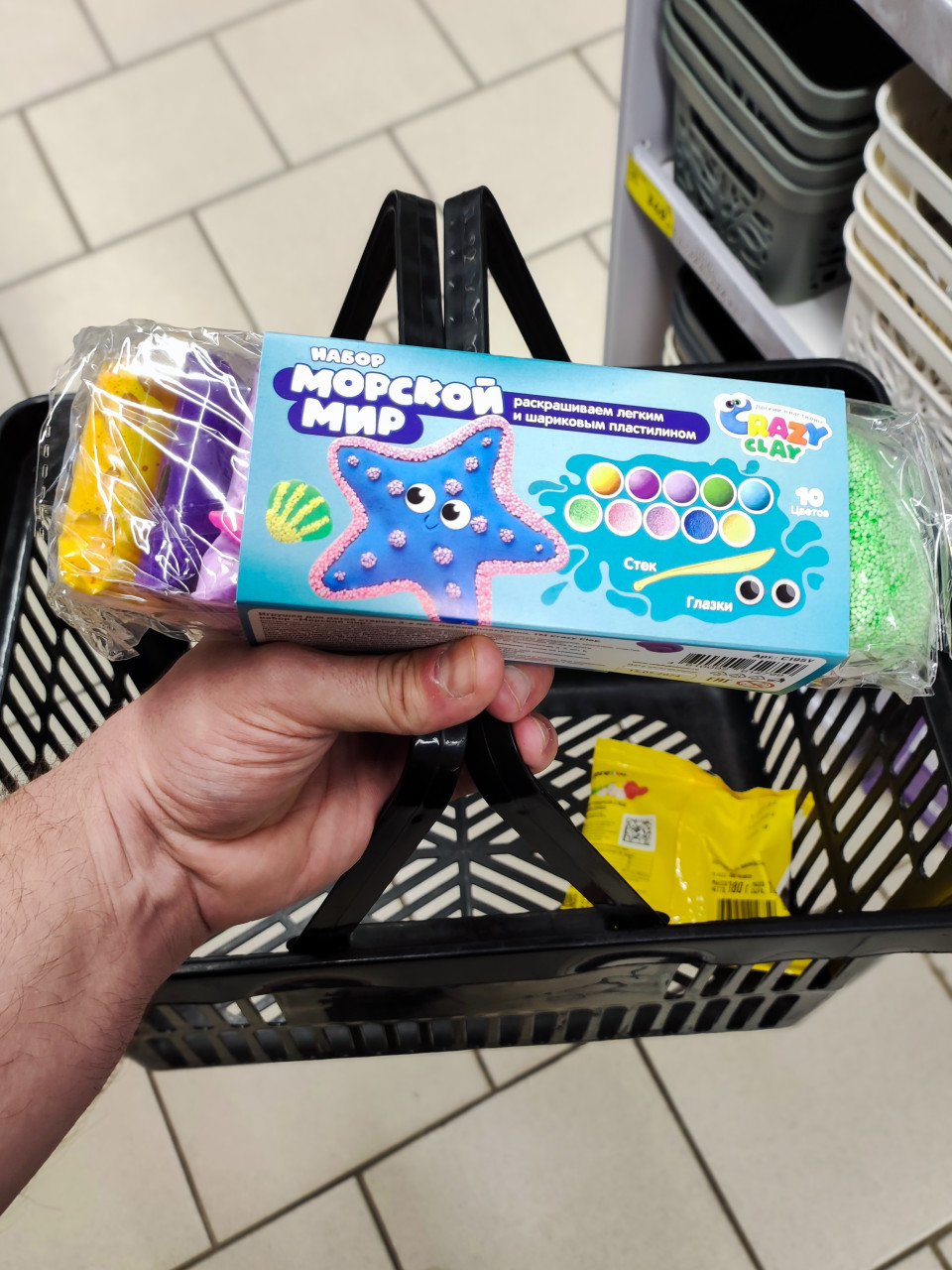 Фото сделано в магазине: в руке держат коробку набора для лепки Crazy Clay с яркой упаковкой «Морской мир», рядом видны пакеты с разноцветным пластилином в плёнке. Ниже находится чёрная пластиковая корзинка для покупок, внутри лежит жёлтая упаковка товара. На фоне светлый кафельный пол и стеллаж с пластиковыми корзинами. Кадр передаёт момент выбора детского творчества и покупки развивающих материалов. Фото подойдёт для тем про детские товары, хобби, творчество, обучение через игру и розничную торговлю.