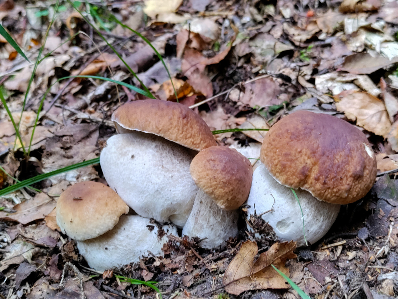 Семейка белых грибов на лесной подстилке среди опавших листьев и травы