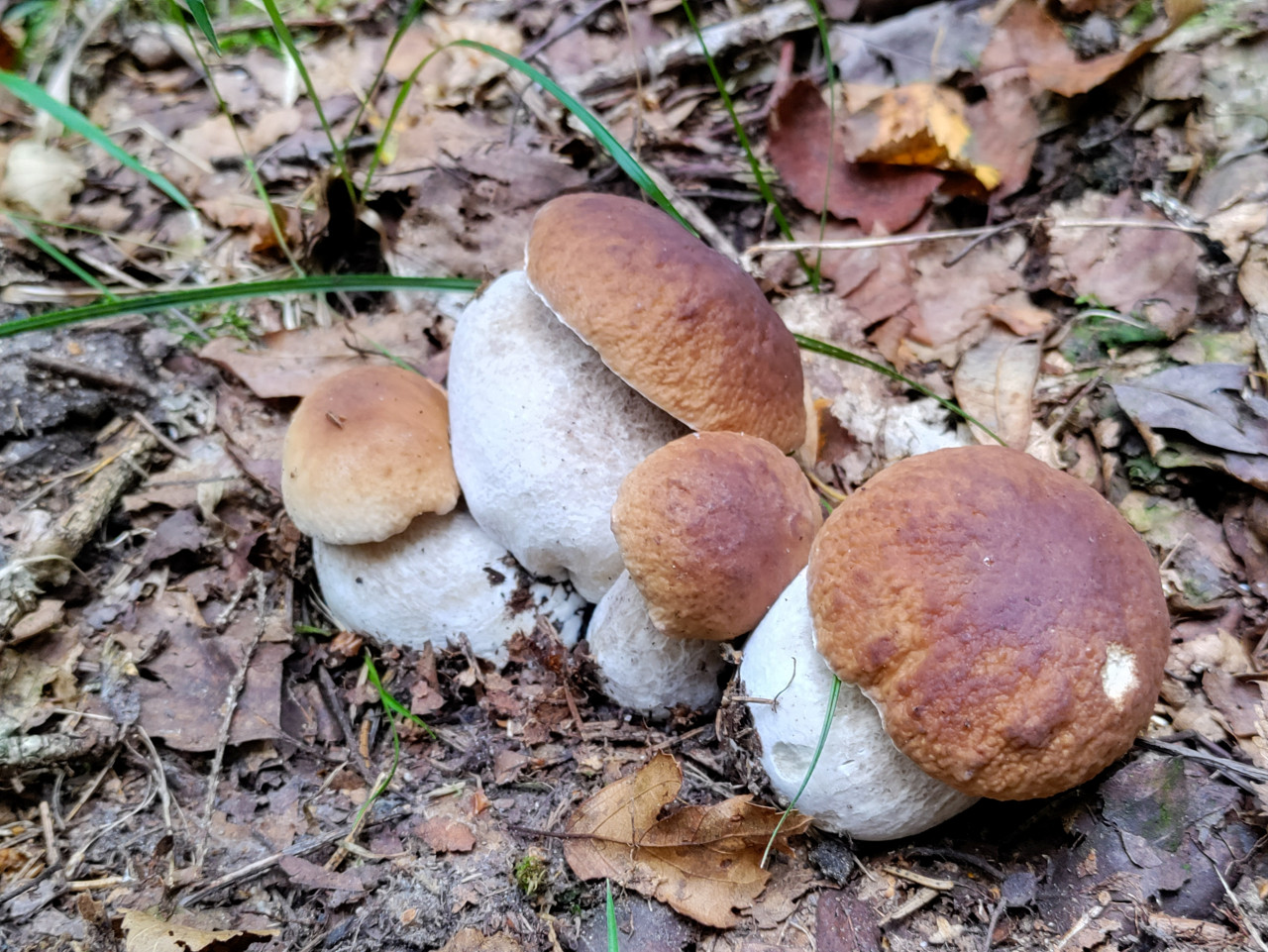 На фотографии крупным планом показаны лесные грибы, растущие группой на мшистой почве среди хвои, травы и опавших листьев. Шляпки округлые, коричневых оттенков, ножки светлые и плотные, вокруг заметны мелкие веточки и природный мусор подстилки. Фон мягко размывается, подчёркивая фактуру грибов и влажную лесную среду, характерную для сезона сбора. Кадр передаёт атмосферу тихого леса и природного урожая без вмешательства человека. Фото можно использовать для материалов о природе, грибной охоте, экологии лесов, сезонных пейзажах и съедобных дарах леса.
