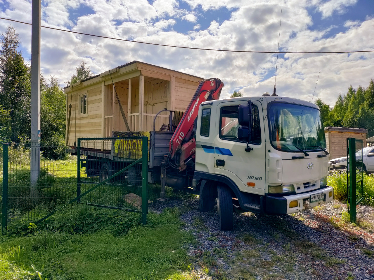 Грузовик с краном-манипулятором привёз деревянный домик на ограждённый дачный участок