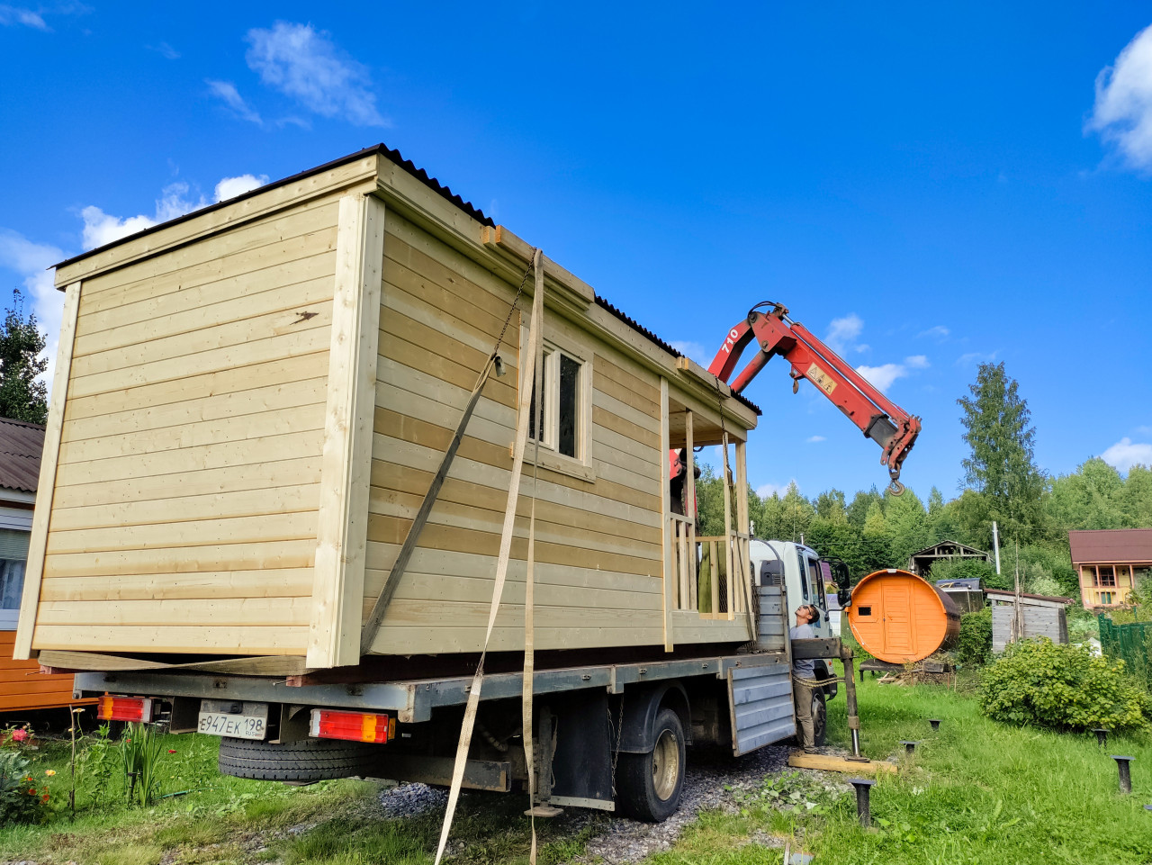 транспорт спецтехника подъёмная техника грузовик кран манипулятор перевозка доставка транспортировка логистика монтаж установка разгрузка стропы загородный участок бытовка деревянная бытовка модульное строение стрела крана такелаж ремни аутригеры подкладка рабочий техника на участке винтовые сваи свайный фундамент дача загородное строительство теплица баня бочка частные дома лес синее небо облака летний деньПохожие фотографии
