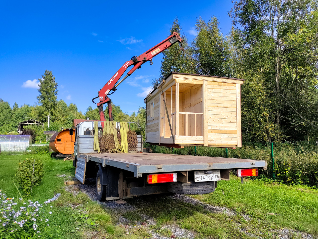 В кадре показан процесс доставки: грузовик с краном-манипулятором подъехал к дачному участку, а деревянная бытовка поднята над платформой и удерживается стропами. Чётко читаются углы и панели конструкции, проёмы, крепёжные элементы, а также работа подъёмного механизма. На территории видны деревья, забор и постройки, дорога и соседние дома, что создаёт контекст загородной застройки. Такая фотография иллюстрирует услуги по перевозке и установке модульных строений, контроль безопасности при подъёме и организацию работ на участке. Использование: сайты строительных компаний, инструкции по монтажу, публикации о дачном благоустройстве.
