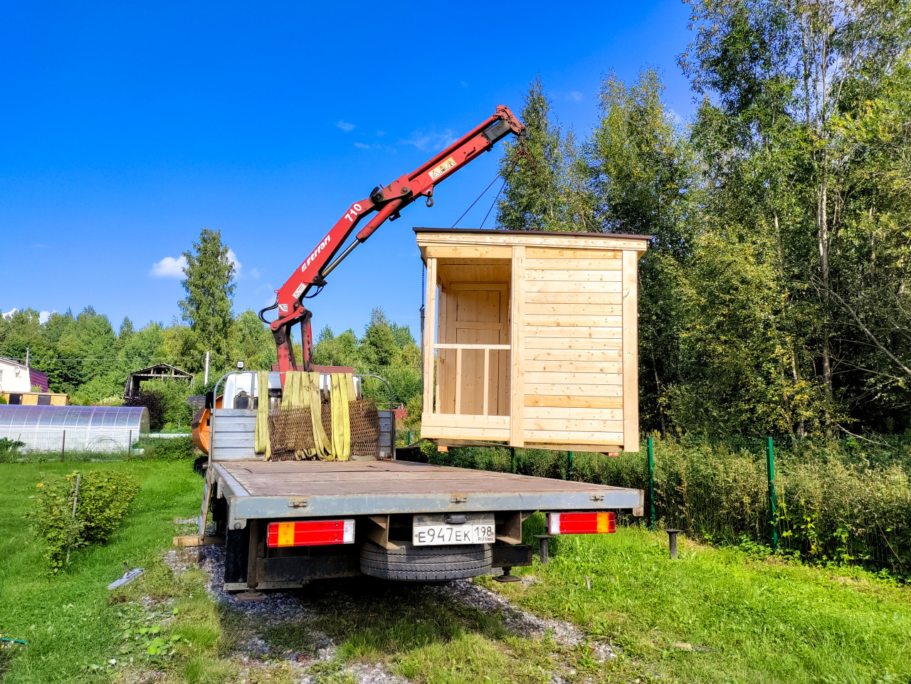 Грузовик с краном-манипулятором поднимает деревянный модуль на дачном участке