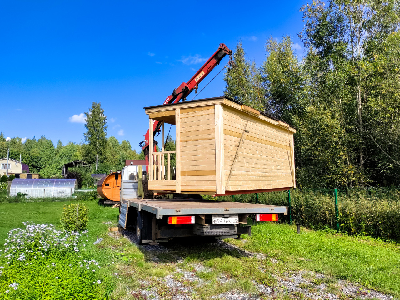 На фотографии деревянный модульный дом на стропах перемещается краном-манипулятором над травянистой площадкой. Хорошо видны крепёжные ремни, металлические элементы строповки, окна и досчатая отделка стен, а также стрела крана и часть грузовика. Вокруг расположены забор, деревья, кустарники и дачные постройки, что указывает на частный загородный участок в тёплое время года при солнечной погоде. Кадр подчёркивает мобильность и скорость установки готовых модулей на месте. Фото можно использовать в материалах о модульном строительстве, доставке домиков, строительной технике и благоустройстве территорий.
