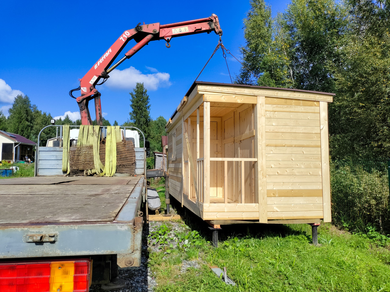 строительство загородное строительство дача загородный участок спецтехника грузовик кран манипулятор перевозка доставка разгрузка монтаж установка подъем груза стропы участок автокран опускание груза модульный дом деревянный домик бытовка хозблок баня каркас строповка крюк аутригеры частный сектор деревья трава ограждение безопасностьПохожие фотографии