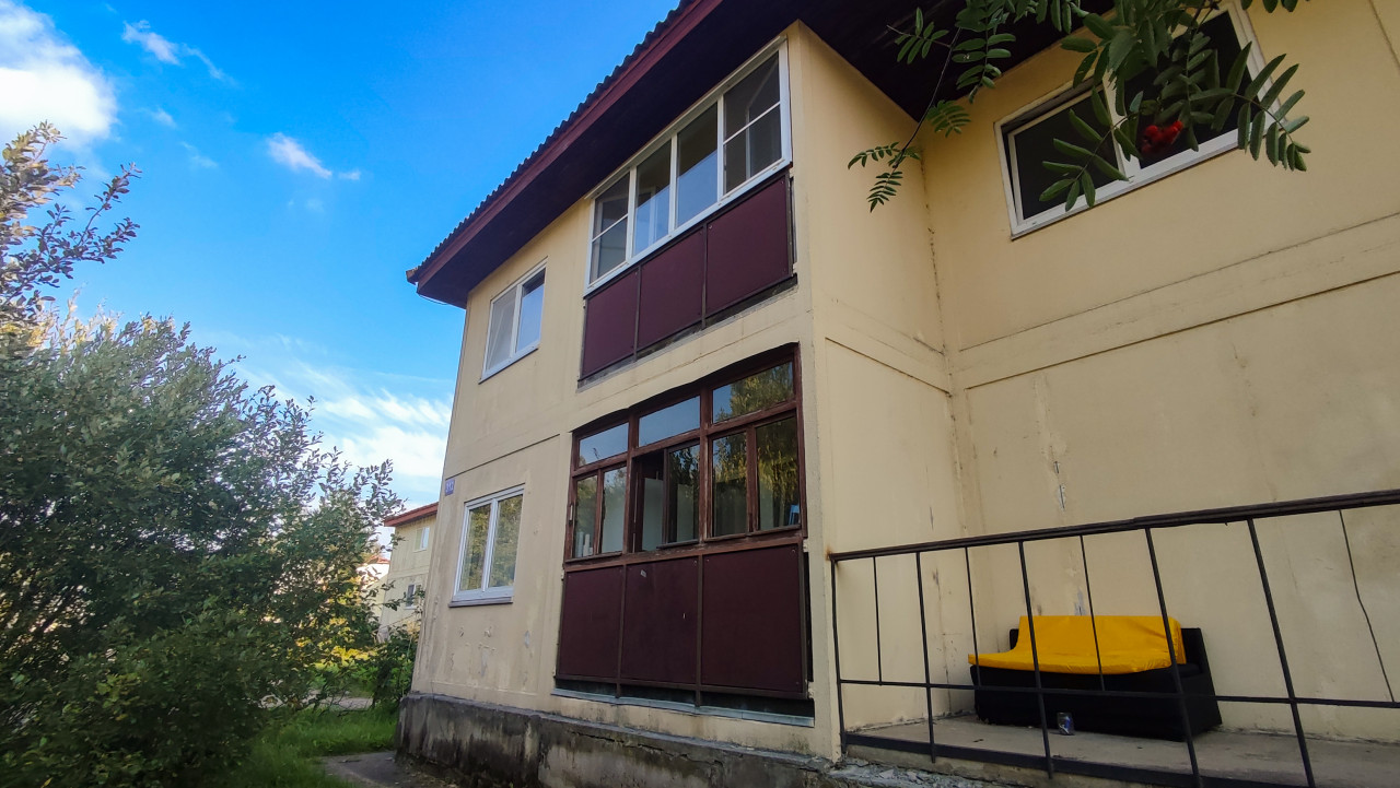 Фасад низкого жилого дома с застеклёнными лоджиями и входной группой