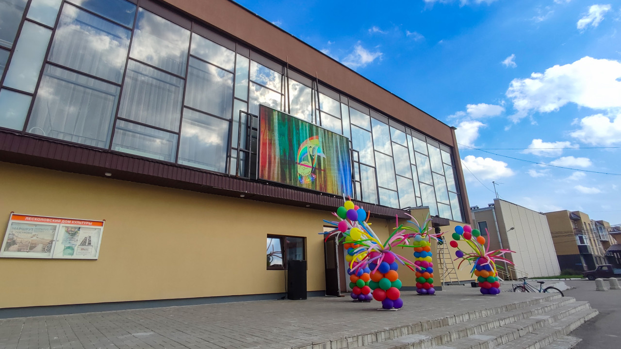 У входа в здание с вывеской «Лесколовский дом культуры» видны широкие ступени, стеклянные двери и большие панорамные окна. Фасад украшен праздничными шарами и гирляндами, рядом стоят велосипеды, у стены размещены афиши и информационные стенды. Площадка перед входом выложена плиткой, вокруг заметны перила, фонари и элементы благоустройства. По виду это общественное учреждение, где проходят концерты, кружки и местные мероприятия. Снимок подойдёт для новостей о культуре, муниципальной инфраструктуре, афиш, а также для иллюстраций про общественные пространства.