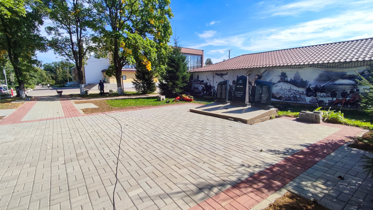 город городская среда общественное пространство архитектура благоустройство памятник стела памятный знак тротуарная плитка мощение площадь мемориал памятные стелы постамент фамилии на камне 1941–1945 Великая Отечественная война память история патриотизм цветы у памятника настенная роспись монументальная роспись военная тема художественное панно стена памяти деревья аллея здания дневной свет тёплый сезон туристическая точкаПохожие фотографии