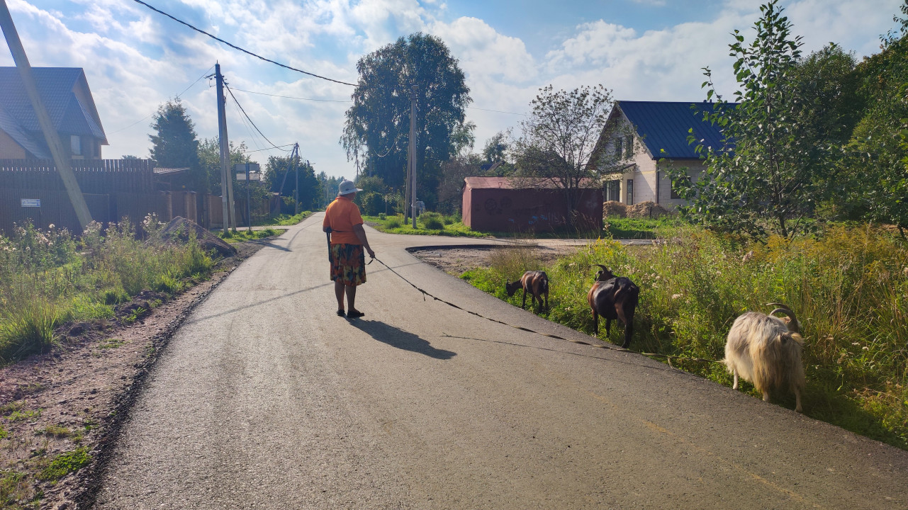 На сельской улице на фоне частных домов и деревянных заборов женщина в яркой футболке и платке ведёт на верёвках несколько коз: белую длинношёрстную и тёмных коз с рожками. Животные идут по свежему асфальту у обочины, рядом видна трава и кусты, над дорогой тянутся линии электропередачи и стоят опоры. Тёплый дневной свет подчёркивает фактуру шерсти и пыль на дороге. Сцена выглядит как обычный деревенский быт, без постановки: человек контролирует стадо, а козы тянутся к зелени. Фото хорошо подойдёт для тем про фермерство, домашний скот, сельскую жизнь, пастьбу и частные хозяйства.
