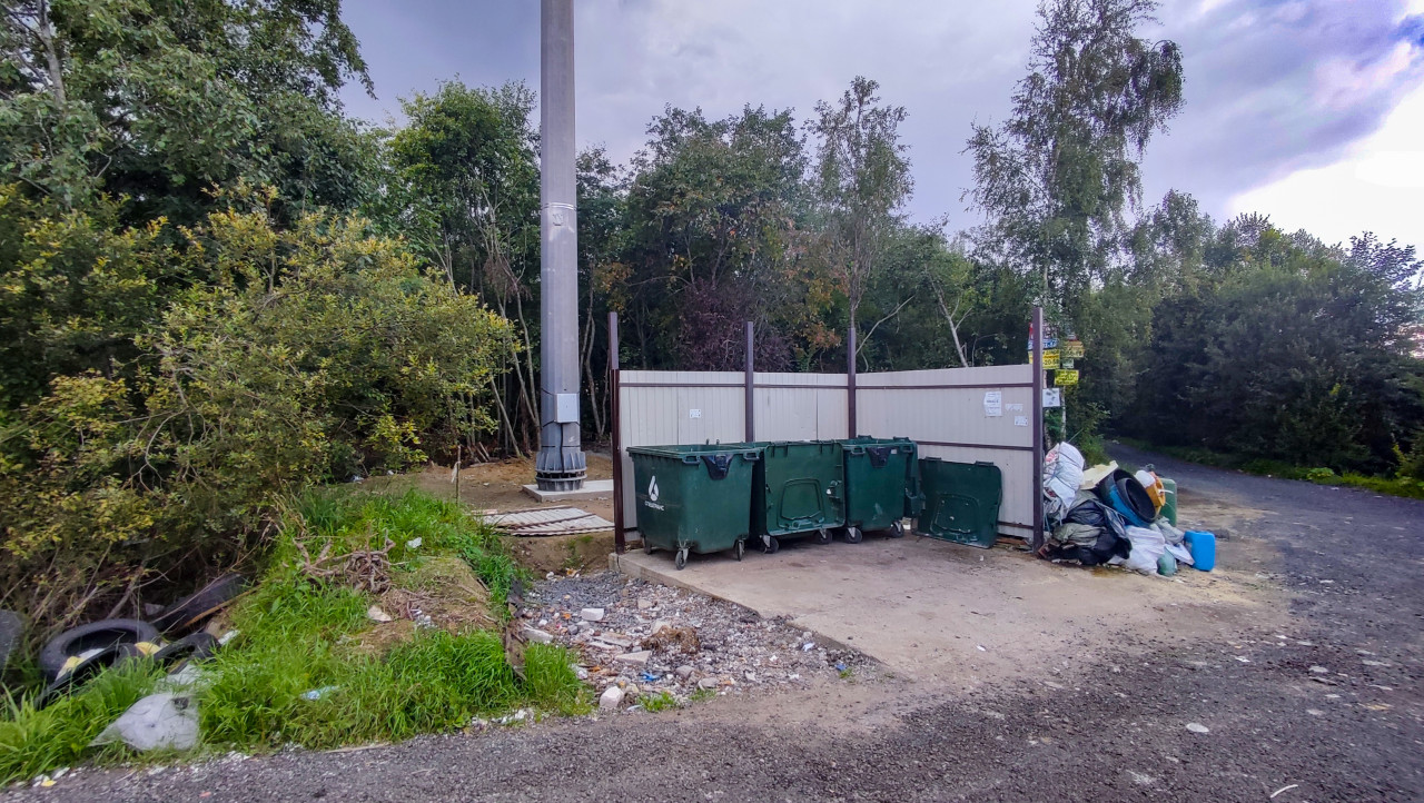 Контейнерная площадка с зелёными мусорными баками и навалом отходов у лесополосы