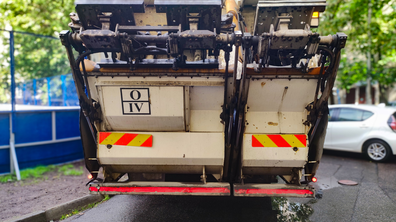 Мусоровоз собирает отходы в городском районе