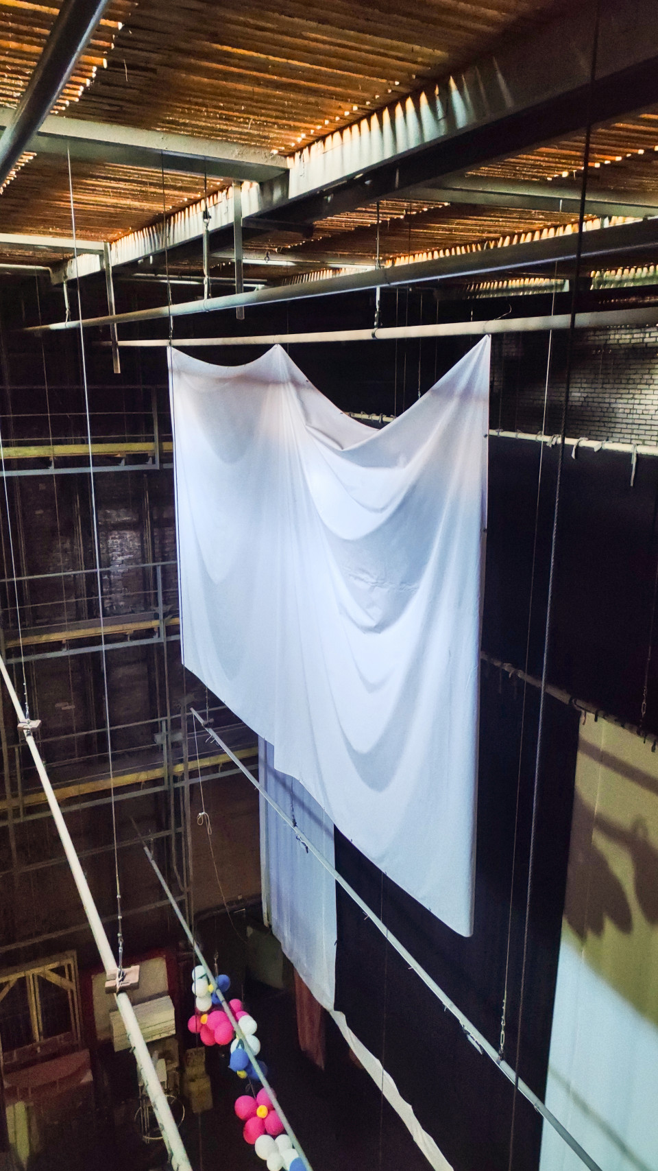 Вертикальный кадр показывает верхнюю часть высокого помещения: под потолком видны металлические балки и деревянный настил, к ним спускаются многочисленные тросы и подвесы. На центральной штанге закреплено большое белое полотно, образующее глубокие складки; ниже в кадре заметна гирлянда из воздушных шаров и часть чёрных занавесей. Комбинация индустриального кирпича и декоративных элементов создаёт атмосферу подготовки пространства. Фото подходит для тем о сценических конструкциях, оформлении мероприятий, закулисье и реконструкции интерьеров.