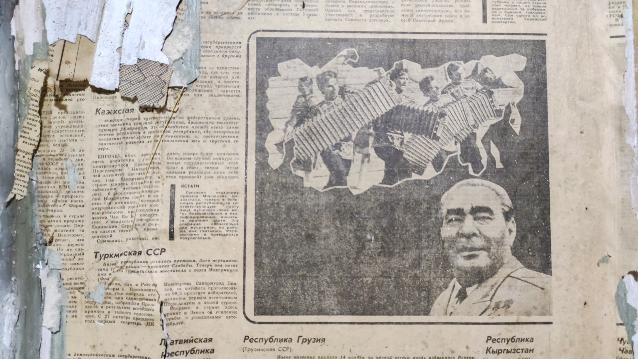 интерьер старая стена газета газетные обои ретро винтаж фактура текстура фон типографика текст кириллица портрет иллюстрация ссср гранж бумага выцветание пожелтение слои краски отслоение штукатурка трещины разрывы пятна царапины советская эпоха старое помещение ремонт демонтаж дизайн коллажПохожие фотографии
