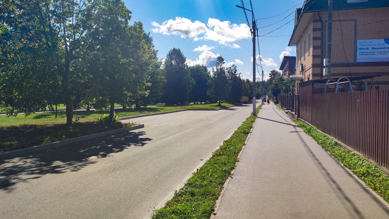 Дорога и тротуар вдоль зелёной зоны рядом с жилым домом и забором