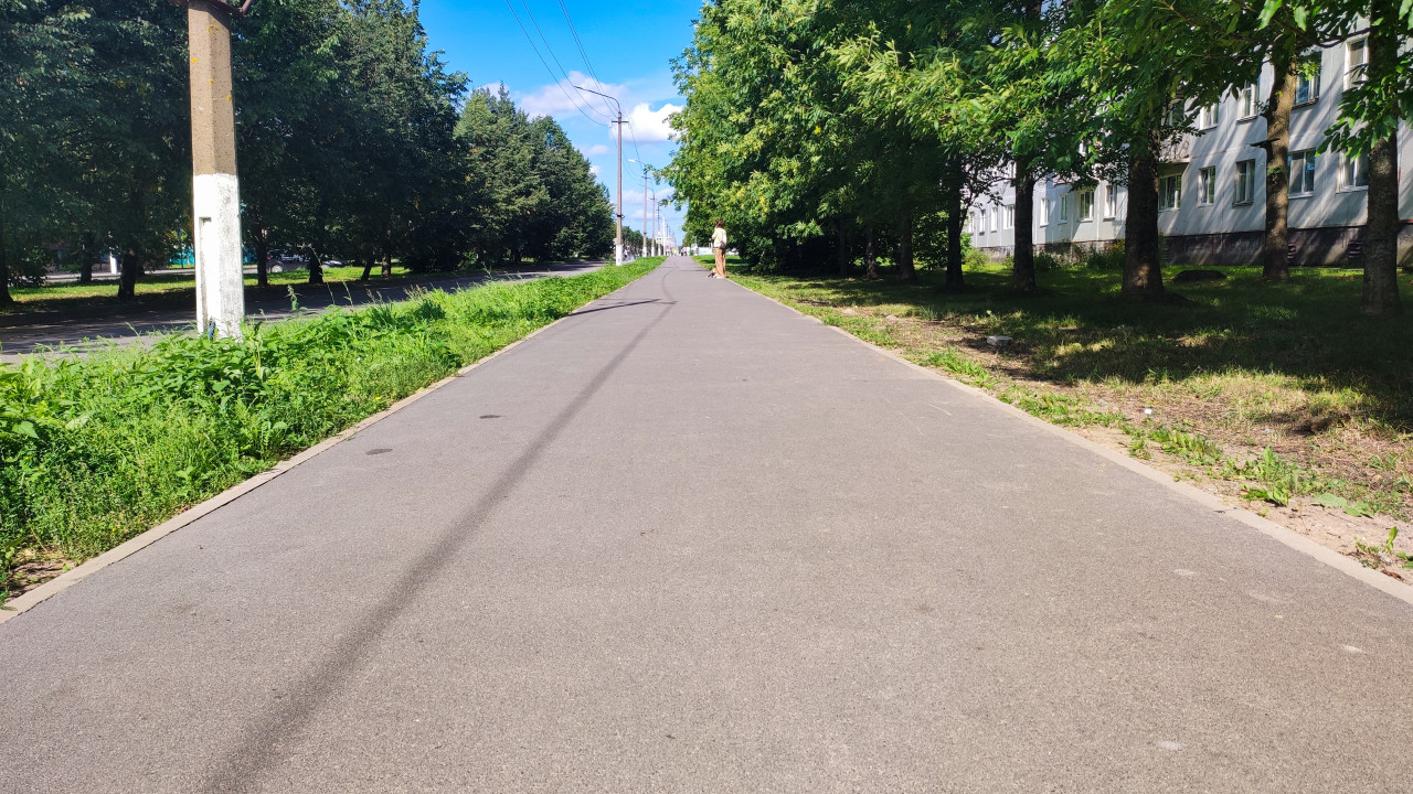 Дорожка вдоль деревьев и жилого дома, уходящая далеко вперёд