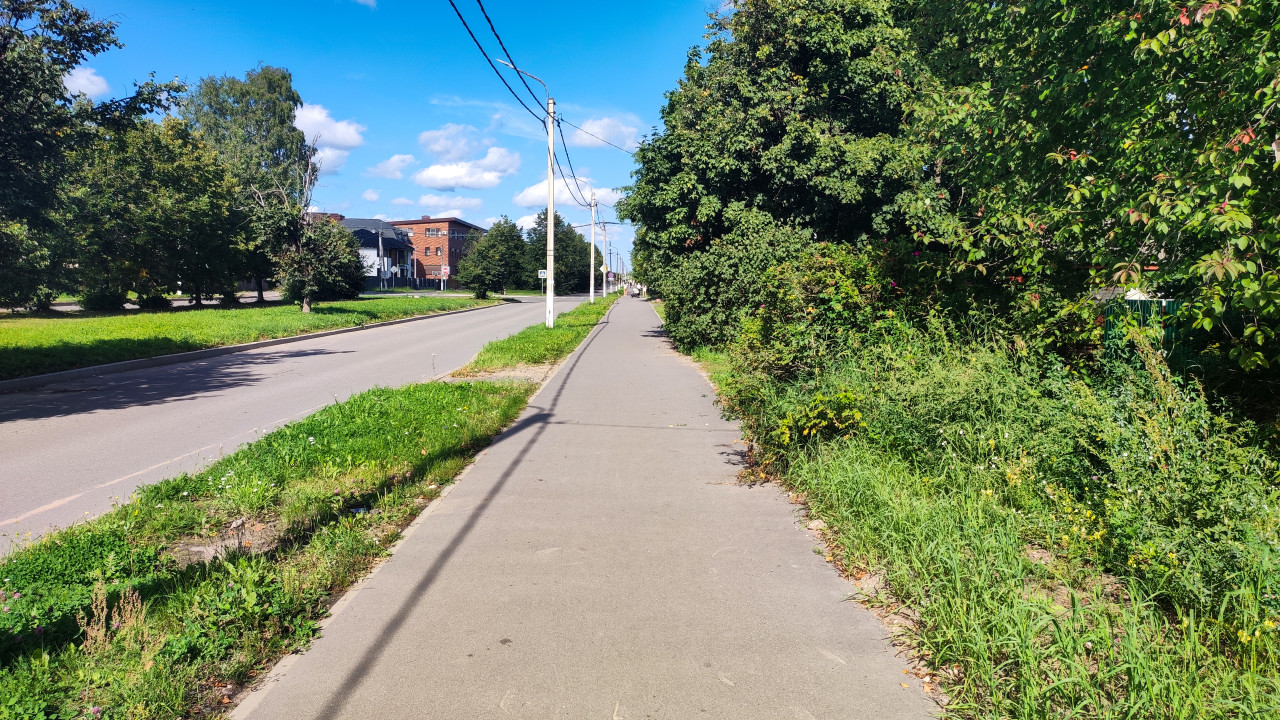 Пустой тротуар из бетонных плит тянется вдоль двухполосной дороги и уходит в перспективу. Слева видна зелёная полоса травы и край проезжей части, справа плотные кусты и деревья нависают над пешеходной зоной, местами трава выбивается на край плит. Вдоль улицы стоят столбы и уличные фонари, сверху проходят воздушные провода. На дальнем плане видны здания, включая краснокирпичный дом, и несколько машин. Фото можно использовать для иллюстраций про городские дороги, тротуары, благоустройство и пешеходную среду.