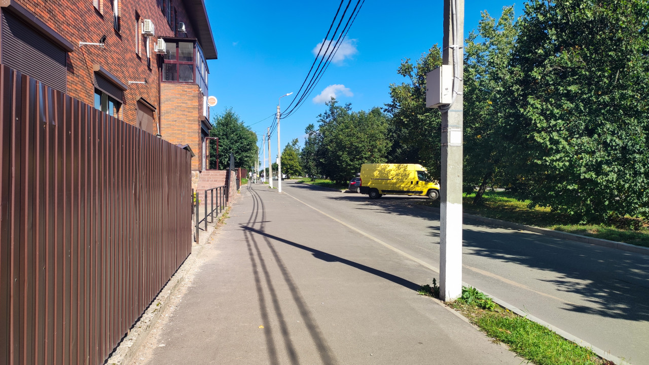 городской пейзаж городские улицы дороги дома улица городская среда город городской вид городская улица городская инфраструктура городской ландшафт урбанистика городская атмосфера уличное пространство тротуар пешеходная дорожка проезжая часть ограждение металлический забор столб опора провода кабели электросети короб на столбе инфраструктура жилой район кирпичный дом деревья тень припаркованный транспорт фургон бордюр асфальт перспектива частный сектор рядом солнечная погода коммуникацииПохожие фотографии