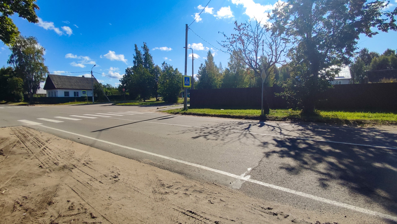 Пешеходный переход у песчаной обочины, дерева и высокого забора вдоль дороги