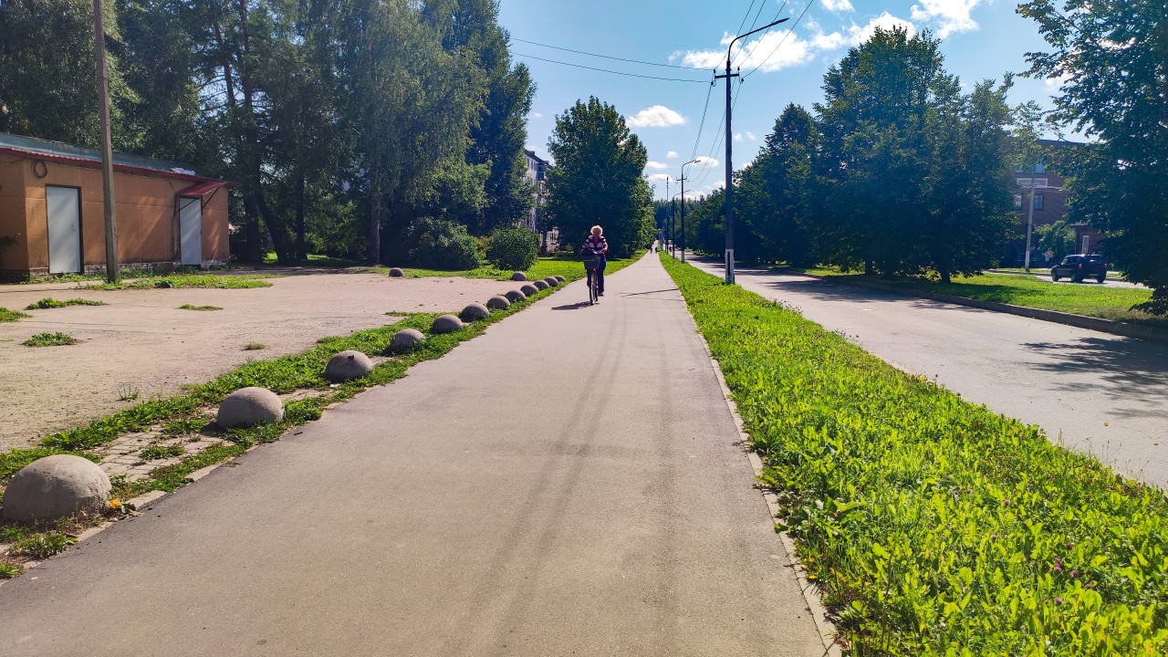 Велосипедист едет по тротуару вдоль дороги и зелёной зоны