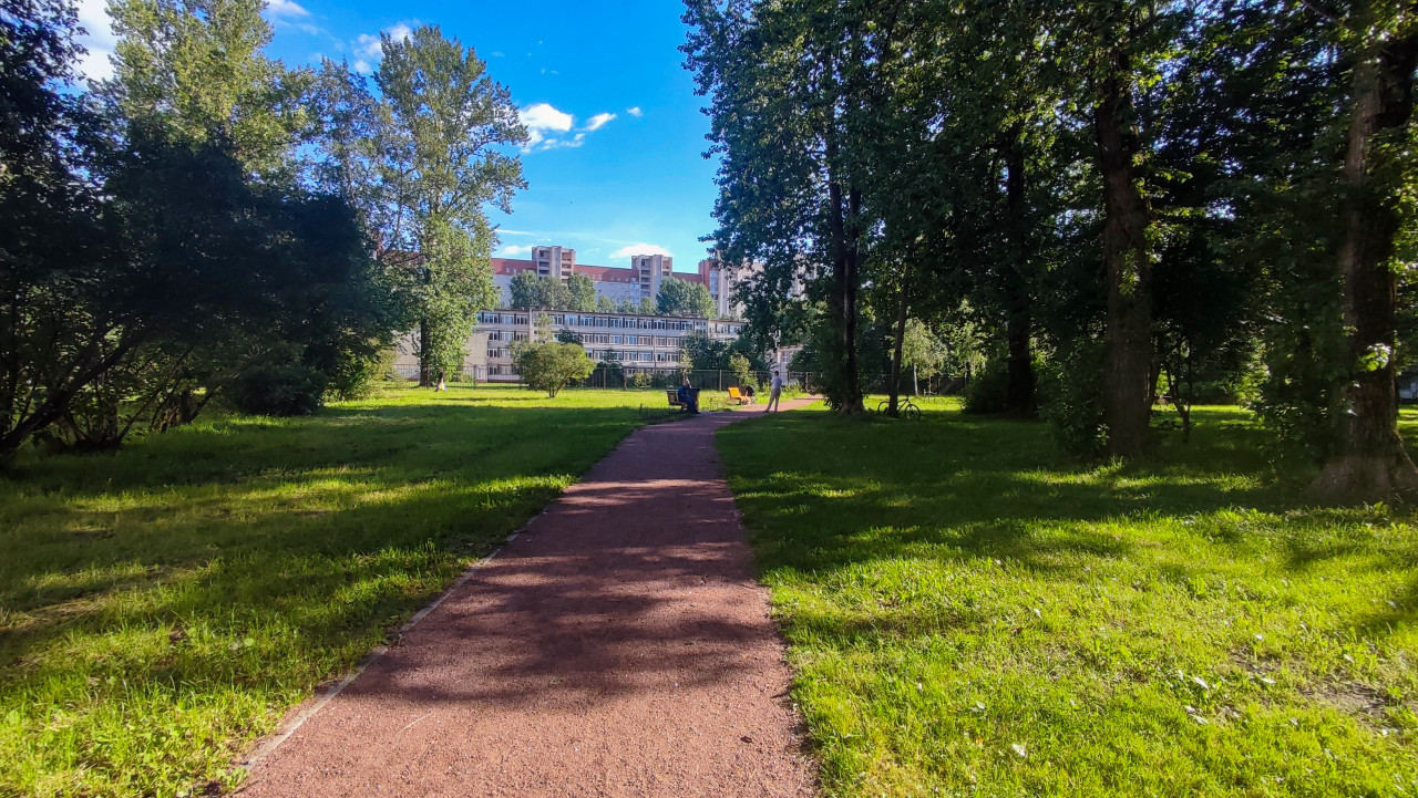 инфраструктура городская среда общественное пространство парк зелёная зона деревья аллея прогулка благоустройство городской парк пешеходная дорожка тропинка газон трава тень солнечный день ясная погода небо облака отдых рекреация люди велосипед ландшафт перспектива жилые дома здание парк отдыха природа в городе активный образ жизниПохожие фотографии
