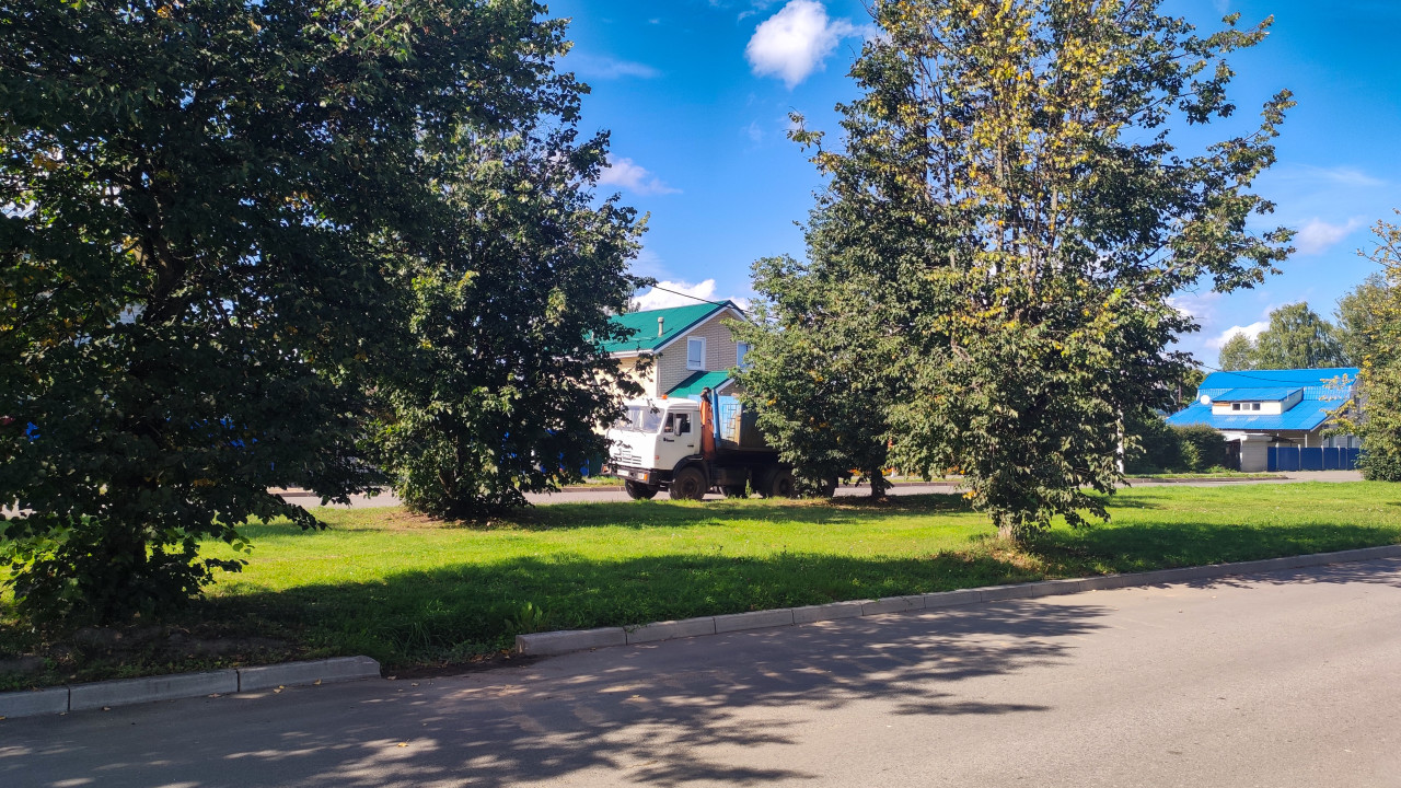 Снято с обочины спокойной улицы: на переднем плане ровный асфальт и бордюр, дальше широкая зелёная лужайка с густыми деревьями и пятнами солнечной тени. За листвой виден белый грузовик с высоким бортовым кузовом, припаркованный у тротуара. На заднем плане стоят частные дома со светлыми фасадами, зелёной и синей крышей, заметны окна, водостоки и заборы участков. Яркое небо с облаками подчёркивает летний свет и зелень. Фото можно использовать в материалах о грузоперевозках, доставке, коммунальном транспорте и городской среде.