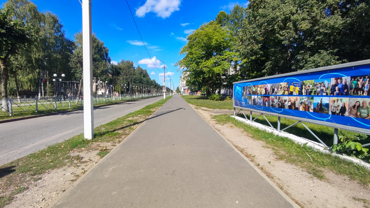 Кадр снят с середины длинного тротуара: ровная асфальтовая дорожка уходит в перспективу вдоль дороги, между ними узкая полоса травы и песчаные обочины. Слева вдоль проезжей части тянется металлическое ограждение и стоят фонари, над улицей идут провода. Справа на заборе закреплён большой синий баннер-стенд с коллажем фотографий людей, рядом густые деревья дают тень. Небо ярко-синее, погода ясная. Фото можно использовать в материалах о городской среде, пешеходной инфраструктуре, рекламе и благоустройстве.
