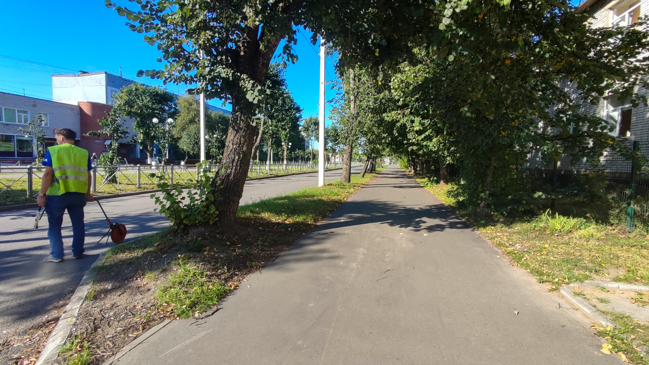 Длинная пешеходная дорожка вдоль улицы и человек с измерительным колесом в зелёной зоне