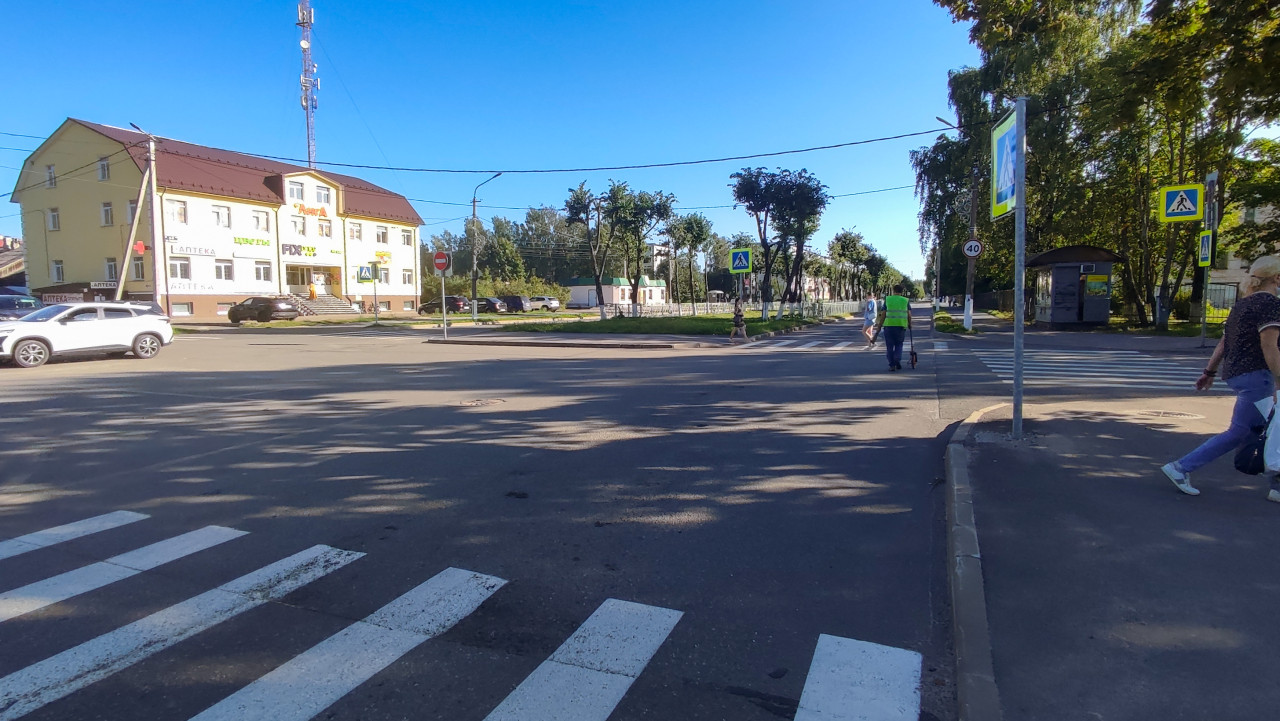 Общий вид городского перекрёстка: на переднем плане пешеходный переход с «зеброй», бордюры и тротуары, рядом стойки с дорожными знаками и дополнительными табличками. По проезжей части едут автомобили, по краям улицы видны ограждения, столбы освещения и воздушные провода, а зелёные деревья дают тень на асфальт. В кадре заметны пешеходы, а дорожник в сигнальном жилете уходит вдоль перехода, катя измерительное колесо. Фото подходит для материалов о городской инфраструктуре, безопасности пешеходов и контроле состояния улиц.