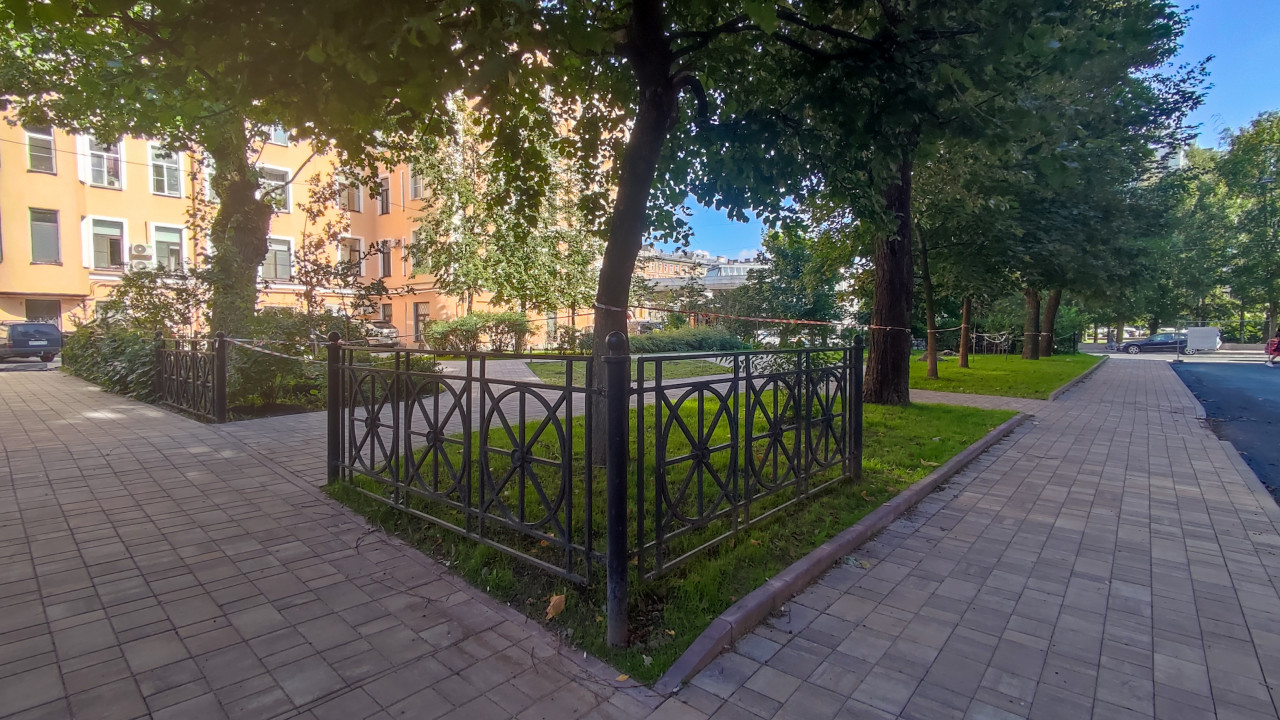 Пешеходные дорожки и газон во дворе с деревьями и металлическим ограждением